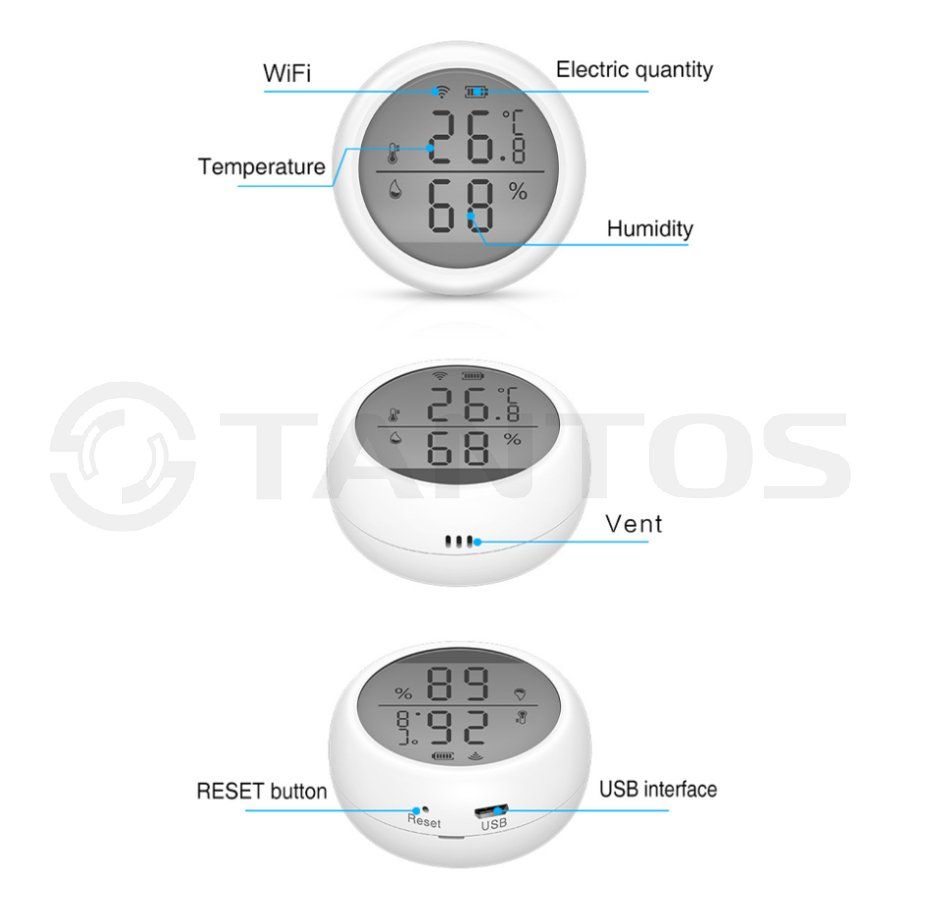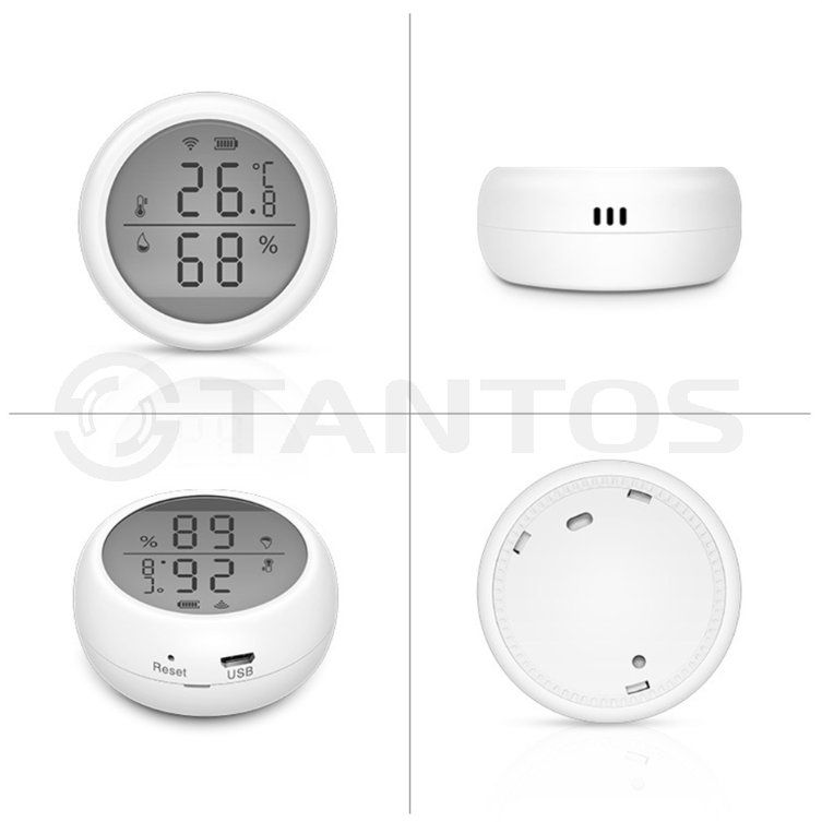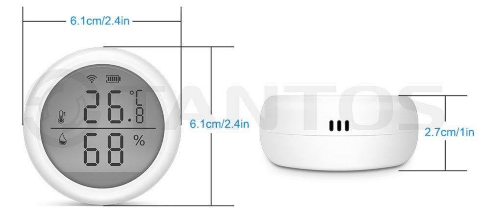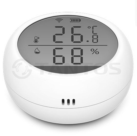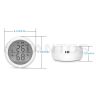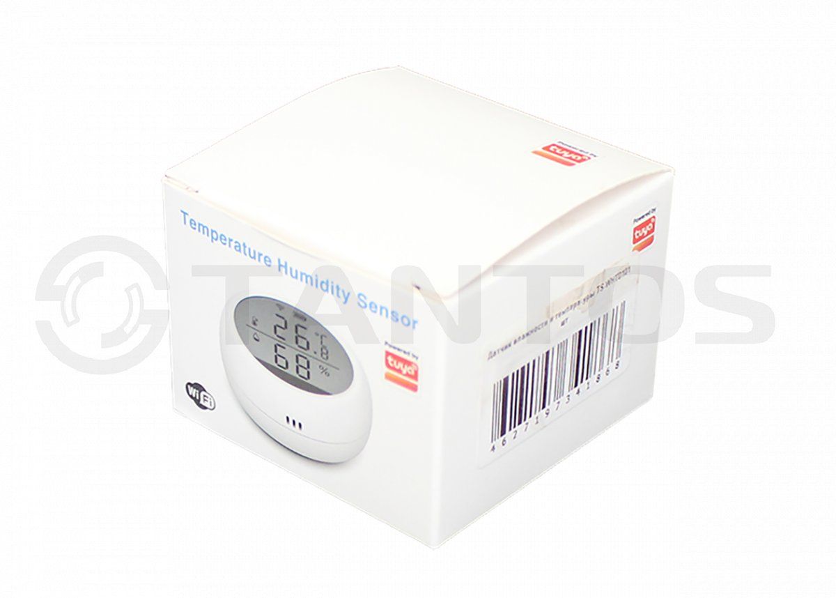 Wi-Fi датчик влажности и температуры с ЖК экраном и возможностью подключения через облачный сервис умного дома Tyua (Smart Life - Smart Living). Питание от батарей 2хААА или microUSB. Поддержка Wi-Fi 802.11b/g/n. Диапазон измерения температуры: 10-55 ℃. Диапазон измерения влажности:0-99%RH. Встроенный зуммер 55 дБ. Настенное крепление