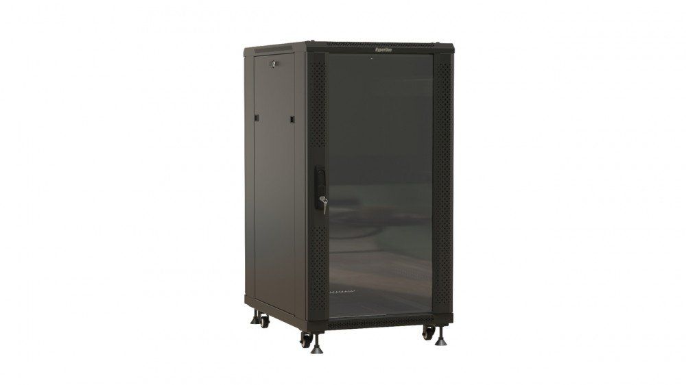 Шкаф напольный 19'', 22U, передняя стеклянная дверь со стальными перфорированными боковинами, задняя дверь сплошная, ручка с замком, допустимая статическая нагрузка 1000 кг, полезная глубина 510 мм, цвет черный, разобранный, 1166x600х600 мм.