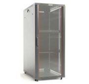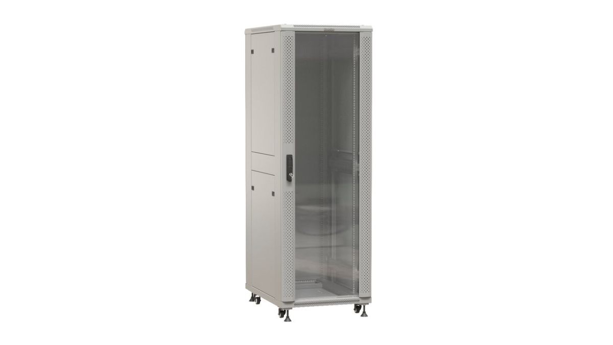 Шкаф напольный 19'', 42U, передняя стеклянная дверь со стальными перфорированными боковинами, задняя дверь сплошная, ручка с замком, 2 вертикальных органайзера, допустимая статическая нагрузка 1000 кг, полезная глубина 360 мм, цвет серый, разобранный, 2055x800х450 мм
