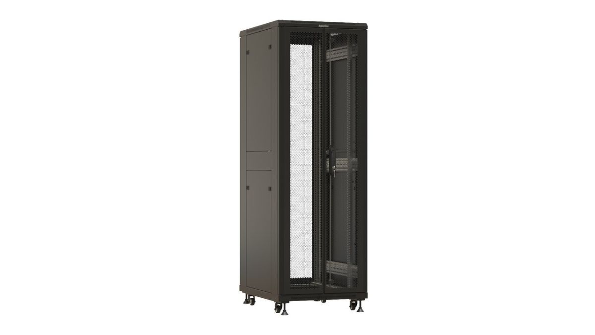 Шкаф напольный 19'', 42U, передняя и задняя распашные перфорированные двери (75%), ручка с замком, 2 вертикальных кабельных организатора, допустимая статическая нагрузка 1000 кг, полезная глубина 510 мм, цвет чёрный, разобранный, 2055x800х600 мм.