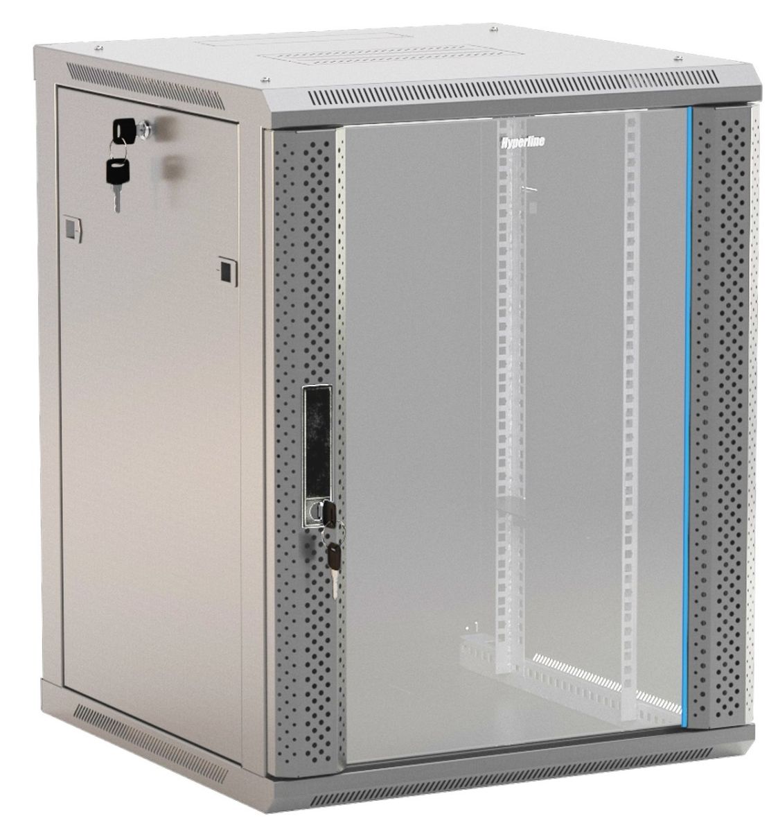 Шкаф настенный 19'', 6U, стеклянная дверь с перфорацией по бокам, ручка с замком, допустимая статическая нагрузка 60 кг, полезная глубина 370 мм, цвет серый, разобранный, 367x600х450 мм