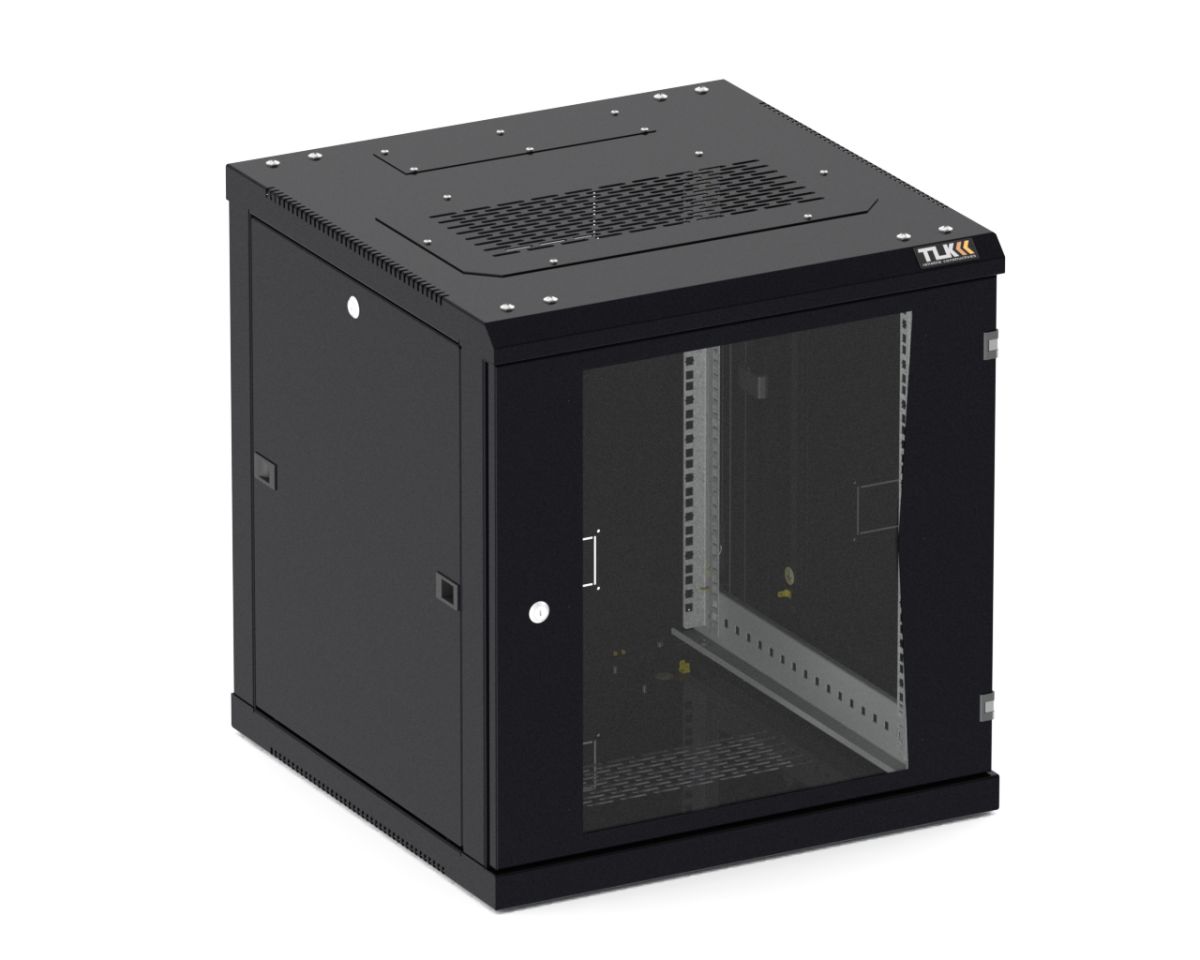 Настенный разборный шкаф 19", 15U, стеклянная дверь, 770х600х600 мм, 2 пары монтажных направляющих, цвет черный.