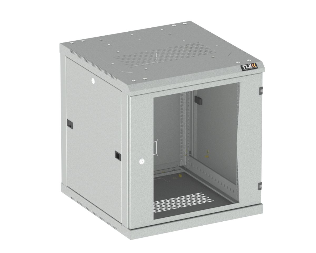 Настенный разборный шкаф 19", 15U, стеклянная дверь, 770х600х600 мм, 2 пары монтажных направляющих, цвет серый.