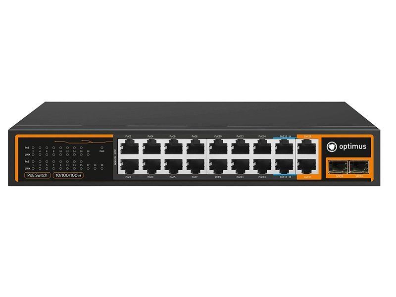 Коммутатор сетевой 20 портовый неуправляемый c PoE; 14xRJ-45 PoE 10/100 Мбит/с (PoE+), 2xRJ-45 PoE 10/100 Мбит/с (PoE++), IEEE 802.3af/at/bt; Uplink 2xSFP/2xRJ-45 10/100/1000 Мбит/с; PoE бюджет 240 Вт (порты 1-14 до 30 Вт, 15-16 до 60Вт); передача до 250м.; AC 220...240В; комплект крепления в 19" стойку; -30... +50°C; 270х170х45 мм.