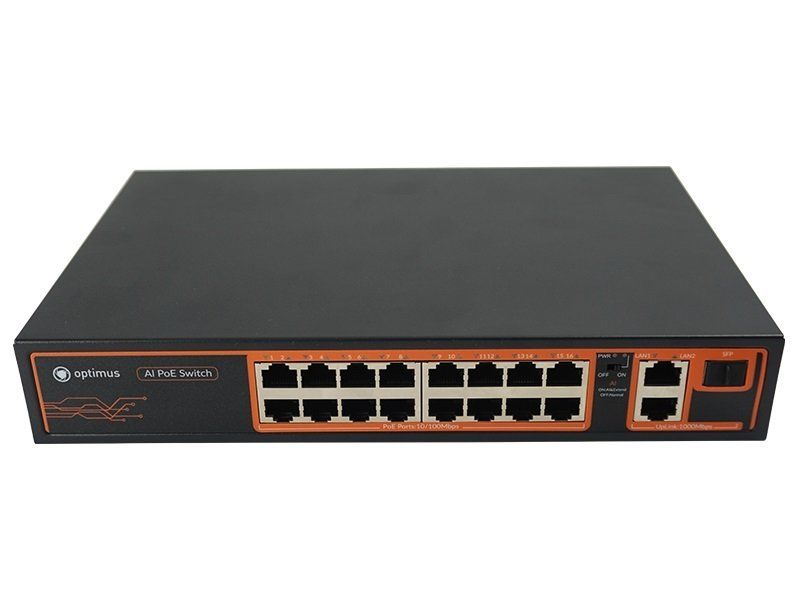 Коммутатор сетевой 19 портовый неуправляемый c PoE; 16xRJ-45 PoE 10/100 Мбит/с (PoE+), IEEE 802.3af/at; Uplink 1xSFP/2xRJ-45 10/100/1000 Мбит/с; PoE бюджет 240 Вт; передача до 250м.; AC 100...250В; комплект крепления в 19" стойку; -30... +40°C; 270х180х45 мм.