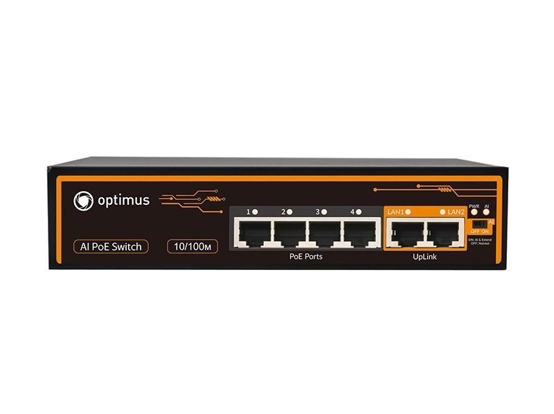 Коммутатор сетевой 6 портовый неуправляемый c PoE; 4xRJ-45 PoE 10/100 Мбит/с (PoE+), IEEE 802.3af/at; 2xRJ-45 Uplink 10/100 Мбит/с; PoE бюджет 65 Вт; AC 220...250В, 65 Вт; -30... +50°C; 190х140х43 мм.