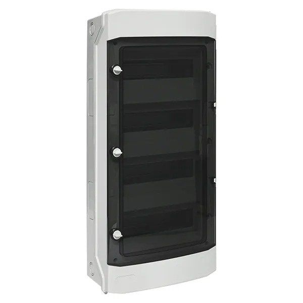 Щит модульный навесной пластиковый (стойкий к УФ) уличный на 48 модулей, 4 ряда, прозрачная матовая дверца; класс ударопрочности IK08, климат.исполнение УХЛ1, IP65; габ.размеры 664х319х144 мм. Цвет серый RAL7035. В комплекте DIN-рейка 4 шт., шины 4+20+4 N и 30 PE, замок ux65-lock приобретается отдельно