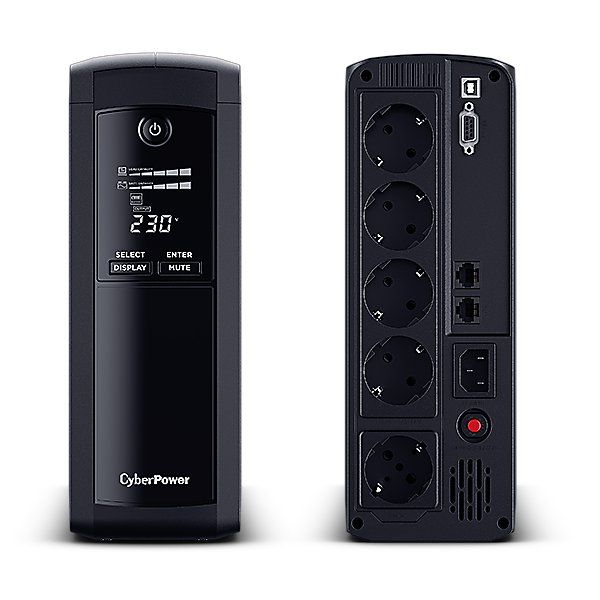 Источник бесперебойного питания Line-Interactive; 1200 ВА(720 Вт), U-вх.167…295 В, время работы при полной нагрузке 12 мин.; выходные разъемы Schuko x 5 шт.; USB/RS-232/RJ11/RJ45; t-раб.0…+40°С, 100x281x355 мм.