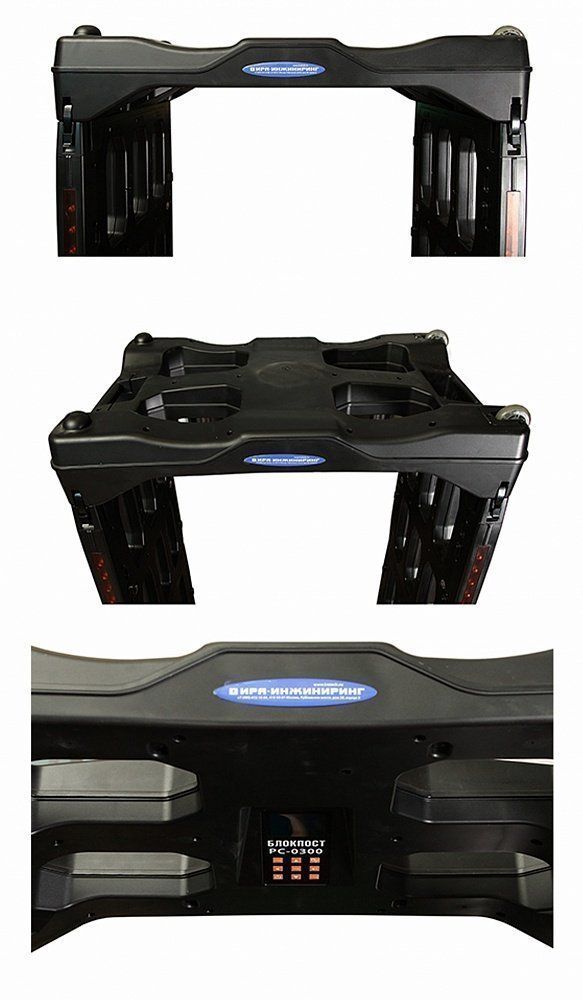 Сборно-разборная металлорамка БлокПост PC-0300 – один из самых функциональных и простых в эксплуатации мобильных детекторов отечественного производства. Конструкция этого досмотрового оборудования состоит из семи частей: 6 панелей и верхней перемычки. Все элементы изготовлены из прочного ПВХ-материала, отличающегося устойчивостью к огню, влаге и пыли. Благодаря этому, данный арочный металлоискатель может быть установлен как в помещениях, так и на улице. Рамка собирается и разбирается силами 1-2 человек за 2-4 минуты.
