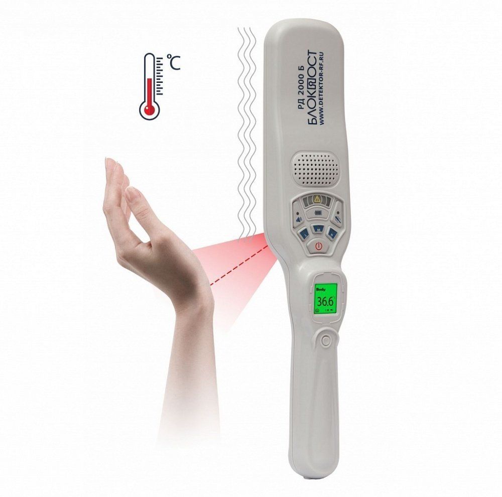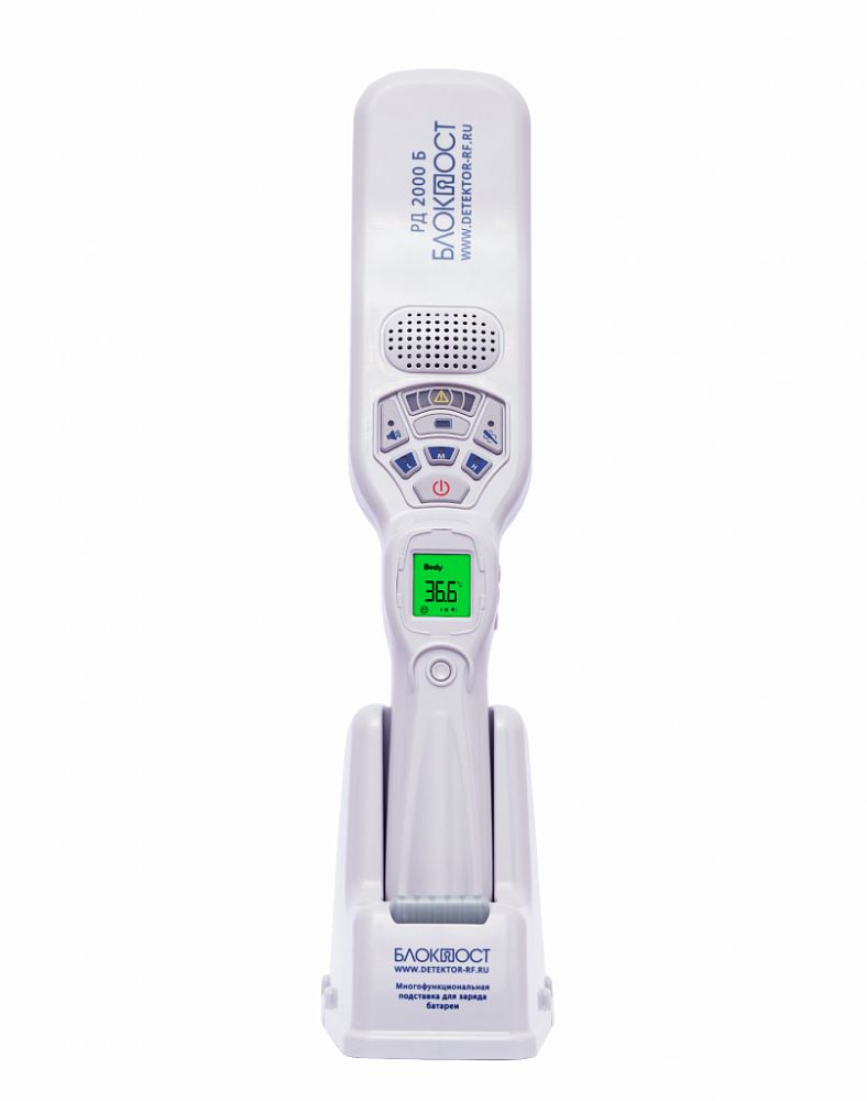 Компактный ручной металлодетектор БЛОКПОСТ РД 2000 Б с измерением температуры тела – универсальное досмотровое оборудование. С его помощью можно выявить и запрещенные к проносу металлические предметы, и лиц с повышенной температурой тела. Благодаря высокой чувствительности, детектор срабатывает даже на небольшие потенциально опасные предметы – лезвия, перочинные ножи, пр. Лезвие этот металлоискатель «видит» с расстояния до 8 см, пистолет с 16 см, а гранату – с 18-20 см.