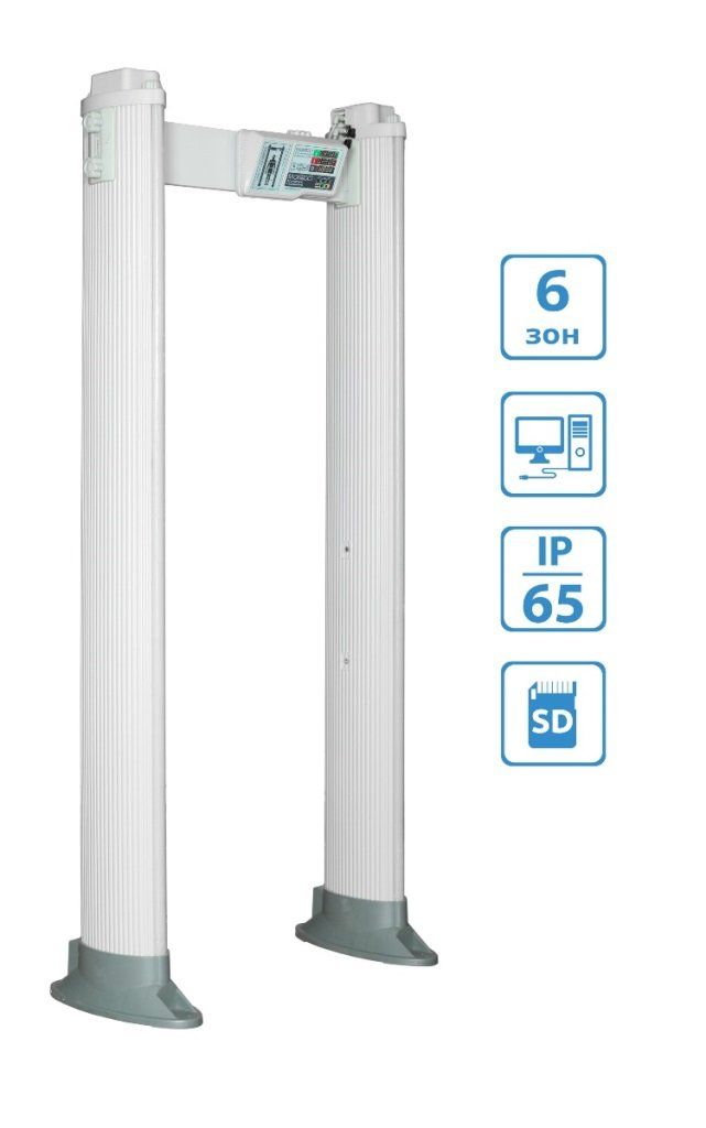 6-зонный арочный металлодетектор. Сверхпрочный с уровнем пылевлагозащиты IP-65. Оснащен новейшей функцией - регистратором событий с SD-card. Наличие «сухих контактов», а также три способа подключения к сети (справа, слева, сверху). Безвредны для человека. 2230х1130х300 мм.