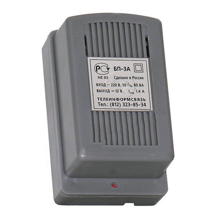 12 В стабилизированный, ток 1,4 А круглосуточно, трансформаторный, пластиковый корпус, t-раб.+5…+40°C, 125х75х60 мм