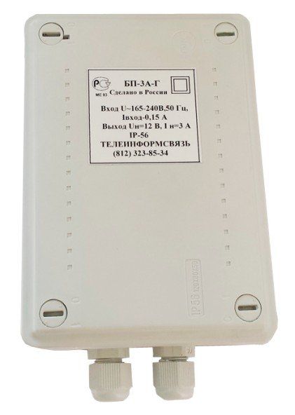 12 В стабилизированный, ток 3 А круглосуточно, импульсный, уличный, пластиковый корпус, IP56, t-раб.-30…+40°C, 130х85х50 мм