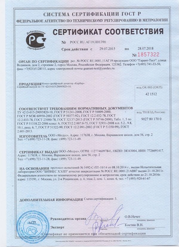ИДД «Кербер» может использоваться в составе досмотрового комплекса на объектах транспортной инфраструктуры в качестве обнаружителя следов взрывчатых веществ (Заключение ФГКУ «В/ч 35533» №16/16/С6/2/1844).