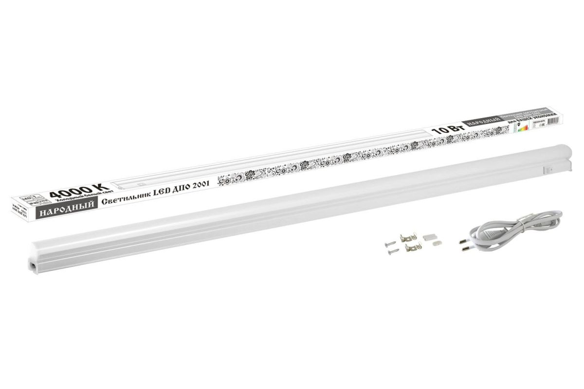Светильник накладной линейный светодиодный, мощность 10 Вт, световой поток 820 Лм, цветовая температура 4000 K, U-вх. 180...265 В, IP40, t-раб.–10...+40°C, габ.размеры 872×22×34 мм.