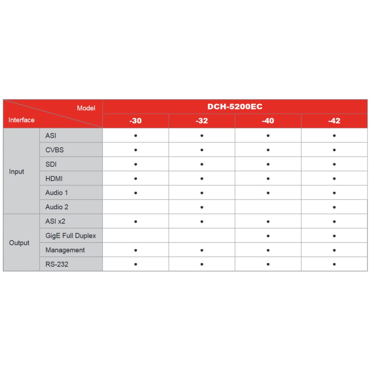 Профессиональный энкодер DCH-5200EC-30 производства компании PBI (China) позволяет энкодировать одну программу кодеком MPEG-4 AVC / H.264. Входной видеосигнал можно подать на аналоговый вход CVBS либо на цифровые входы SD-SDI или HDMI. Входной аудиосигнал можно подать на разъём DB-9 через специальный переходник (идёт в комплекте). Устройство поддерживает редактирование таблиц SDT и NIT, а также может вложить выходной SPTS поток в поток MPTS, приходящий на вход ASI.