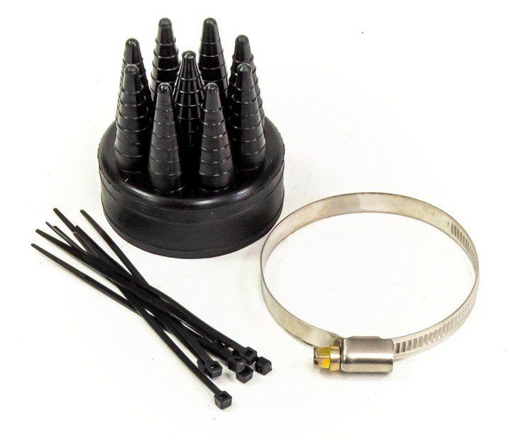 Кабельный гермоввод ГВкаб D 57 (компл. 0) Гермо-С; внутр. диаметр D 57 мм, высота изделия 64 мм, наружный диаметр D 66 мм, установочные отверстия для кабеля D от 2,5 до 10 мм - 8 шт, D от 2,5 до 15 мм - 1 шт. Комплект поставки: резиновая уплотнительная манжета - 1 шт; хомут пластиковый - 9 шт; хомут червячный - 1 шт; инструкция по монтажу - 1 шт; упаковка - 1 шт.