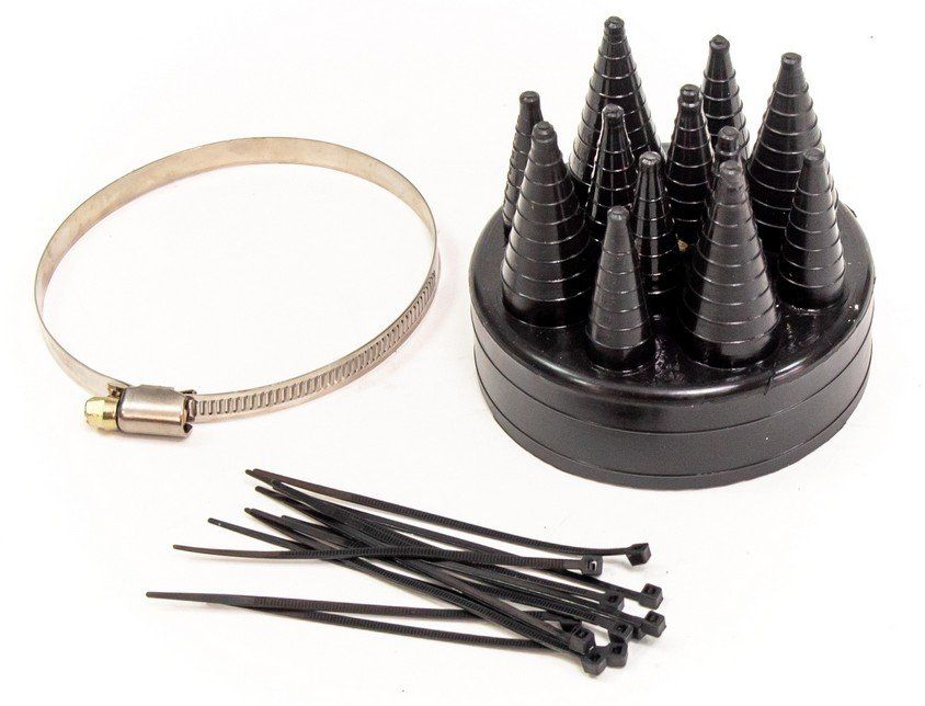 Кабельный гермоввод ГВкаб D 89 (компл. 0) Гермо-С; внутр. диаметр D 89 мм, высота изделия 80 мм, наружный диаметр D 100 мм, установочные отверстия для кабеля D 3…12 мм - 8 шт, D от 3,5 до 20 мм - 4 шт. Комплект поставки: резиновая уплотнительная манжета - 1 шт; хомут пластиковый - 12 шт; хомут червячный - 1 шт; инструкция по монтажу - 1 шт; упаковка - 1 шт.