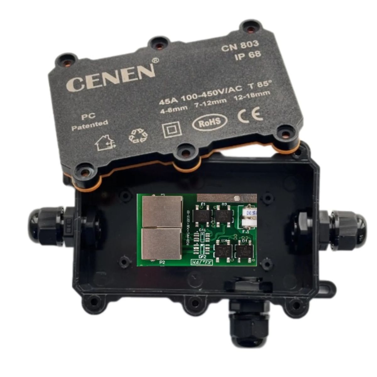 Исполнение устройства печатная плата в пластиковой коробке разветвительной Cenen с кабелем заземления. В основе грозозащиты стоит модуль SNR-SPNet-B1000, реализована базовая версия защиты: «линия - земля». Gigabit Ethernet обеспечивается на длине кабеля 75м, 10/100Base Ethernet обеспечивается на длине кабеля 100м.
