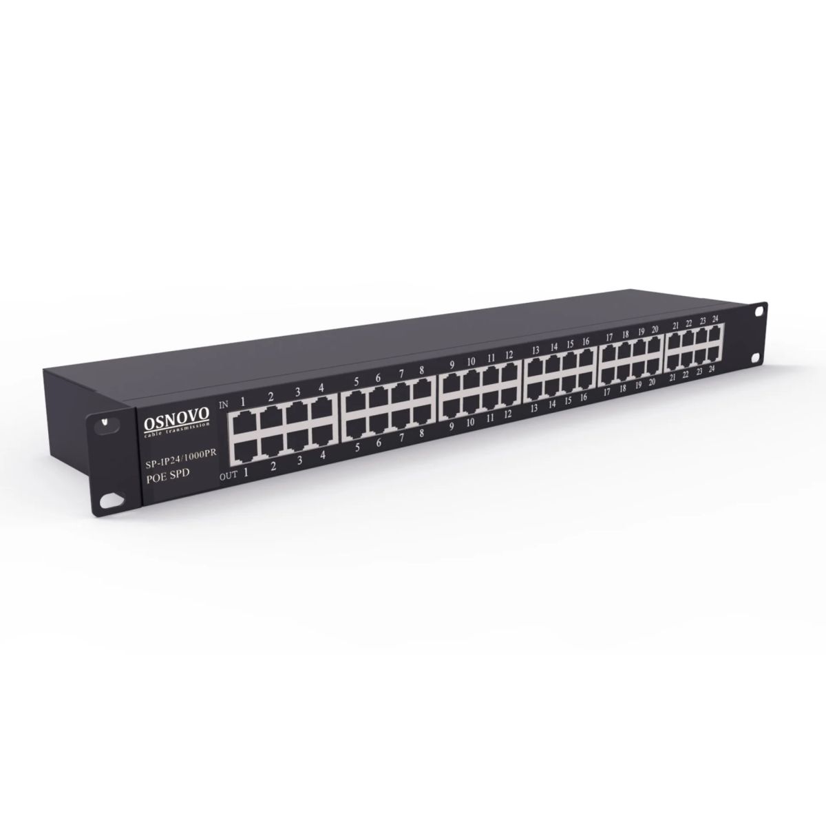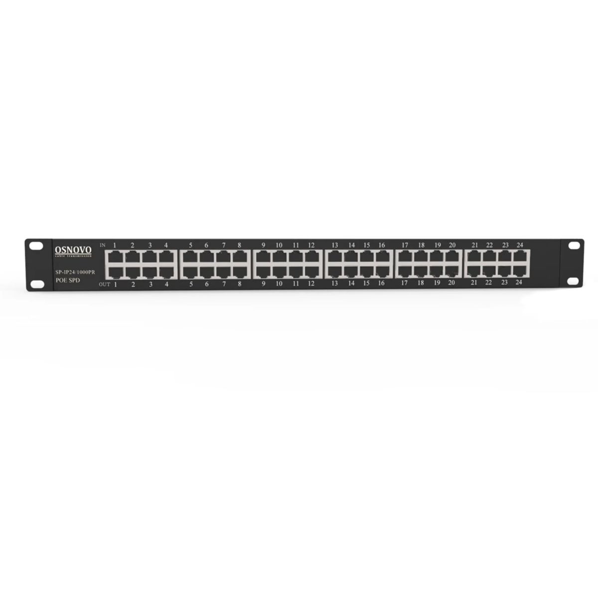 1U устройство грозозащиты для локальной вычислительной сети на 24 порта (скорость до 1000 Мб/с) с защитой линий PoE (af/at, методы A + B, контакты 1/2, 3/6, 4/5, 7/8).