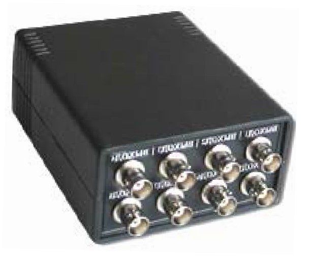 8-и канальный.Коробка размером 160х110х110 мм с разъемами BNC для подключения линий связи и винт. зажимом для подключения заземления.