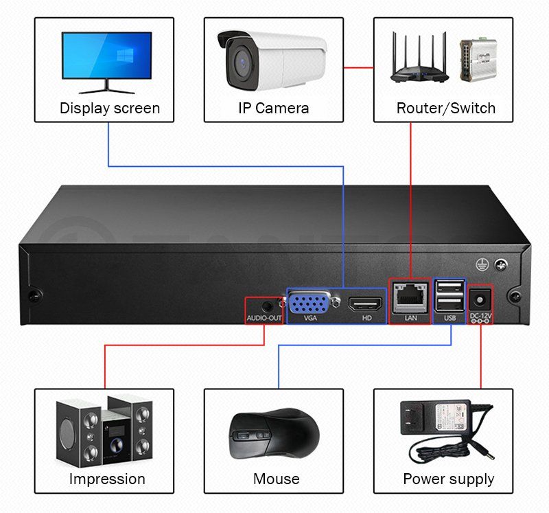 Сетевой 9 канальный H.265/H.264 регистратор для ONVIF IP камер. Подключение и отображение до 9 камер 5 мегапиксельных. Поддержка облачного сервиса Tyua (Smart Life - Smart Living), (iPhone, Android). Одновременный просмотр, запись и работа с архивом. HDD до 8Тб. Порт USB 2.0 – 2 шт, 100Mb Ethernet, HDMI/VGA (1920×1080). БП, мышь в комплекте. Запись непрерывная, по расписанию, вручную, по детектору движения. Подключение IP камер по NETIP, ONVIF и RTSP.