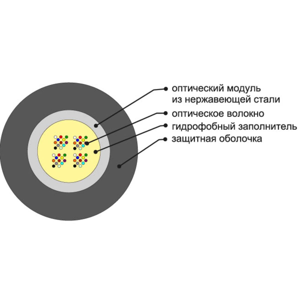Кабель состоит из сердечника – модуля из нержавеющей стали. Внутри оптического модуля свободно уложены оптические волокна. Свободное пространство внутри оптического модуля заполнено гидрофобным заполнителем. Поверх сердечника – модуля накладывается полиэтилен высокой плотности.