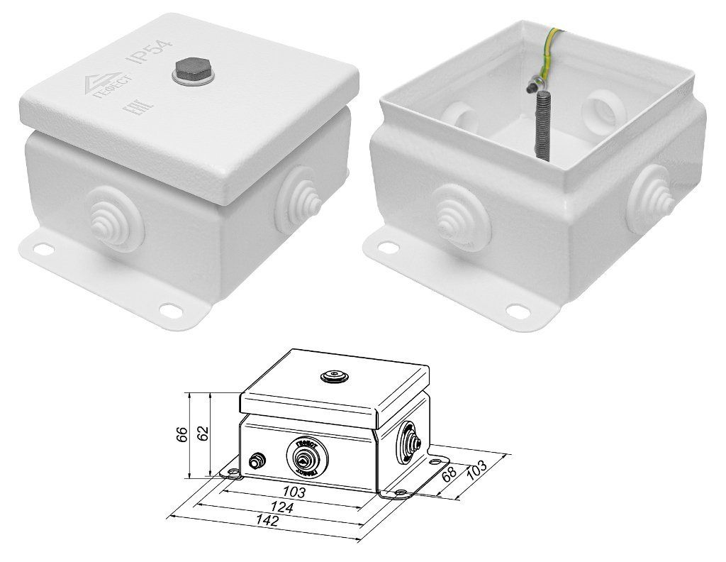 Коробка монтажная огнестойкая, 4 ввода под кабель D 4...17 мм, IP55, t-раб.-40…+80°C, габ.размеры 103х103х62 мм, оцинкованная сталь с полимерной окраской.