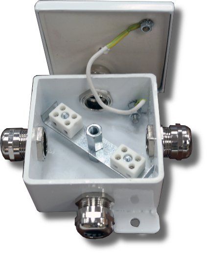 Корпус коробки целиком изготовлен из стали 2,5-3 мм. Имеет двойную защиту от коррозии ( гальваническое покрытие и покраска). Крышка прижимается к корпусу через силиконовую прокладку. Винт крепления крышки снабжен уплотняющей тарельчатой шайбой с фторопластовым покрытием. Внутри корпуса коробки установлены керамические клеммные колодки, обеспечивающие соединение "под винт", и клемма заземления. В боковых стенках устанавливаются металлические кабельные вводы. Крепление коробки к элементам конструкций рекомендуется осуществлять на приварные пластины с применением гаек и винтов или с помощью саморезов и металлических дюбелей.