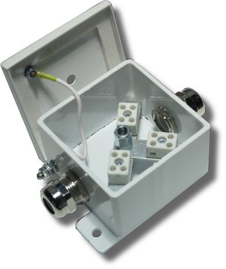 Корпус коробки целиком изготовлен из стали 2,5-3 мм. Имеет двойную защиту от коррозии ( гальваническое покрытие и покраска). Крышка прижимается к корпусу через силиконовую прокладку. Винт крепления крышки снабжен уплотняющей тарельчатой шайбой с фторопластовым покрытием. Внутри корпуса коробки установлены керамические клеммные колодки, обеспечивающие соединение "под винт", и клемма заземления. В боковых стенках устанавливаются металлические кабельные вводы. Крепление коробки к элементам конструкций рекомендуется осуществлять на приварные пластины с применением гаек и винтов или с помощью саморезов и металлических дюбелей.