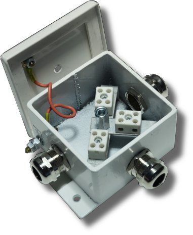 Корпус коробки целиком изготовлен из стали 2,5-3 мм. Имеет двойную защиту от коррозии ( гальваническое покрытие и покраска). Крышка прижимается к корпусу через силиконовую прокладку. Винт крепления крышки снабжен уплотняющей тарельчатой шайбой с фторопластовым покрытием. Внутри корпуса коробки установлены керамические клеммные колодки, обеспечивающие соединение "под винт", и клемма заземления. В боковых стенках устанавливаются металлические кабельные вводы. Крепление коробки к элементам конструкций рекомендуется осуществлять на приварные пластины с применением гаек и винтов или с помощью саморезов и металлических дюбелей.