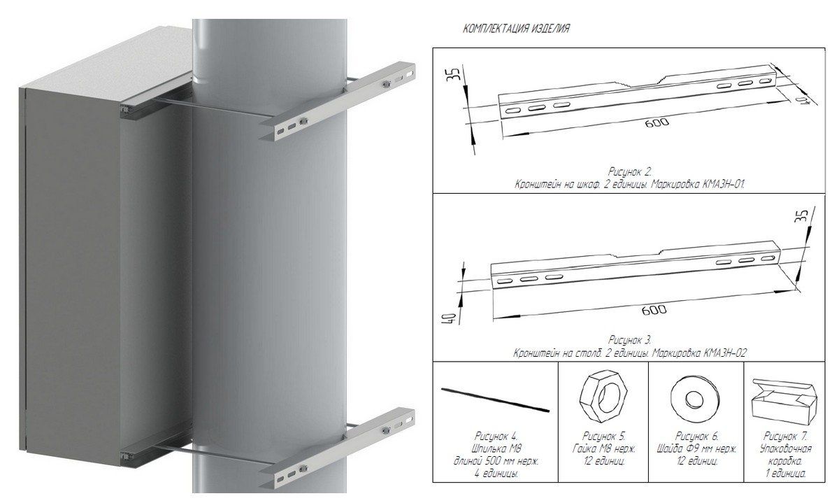 Крепление на опору (столб) до 350 мм, для термошкафов шириной 400-600 мм, под шпильку M8. Допустимая нагрузка 150 кг. Опорная и ответная часть в комплекте.