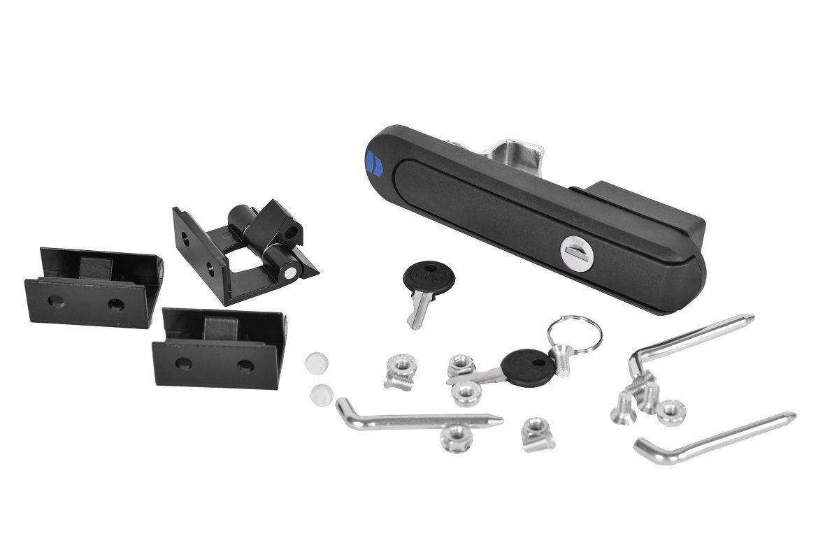 Комплект монтажный для шкафов ШТК-М высотой 18U-38U, комплектация: замок RS-710-NJ17536.35-9005 - 1 шт, ключ - 2 шт, петля 398-1.2.2 - 3 шт, винт потай WS M6х12 КВ - 6 шт, гайка зубчатая N6KZ M6 B - 6 шт.