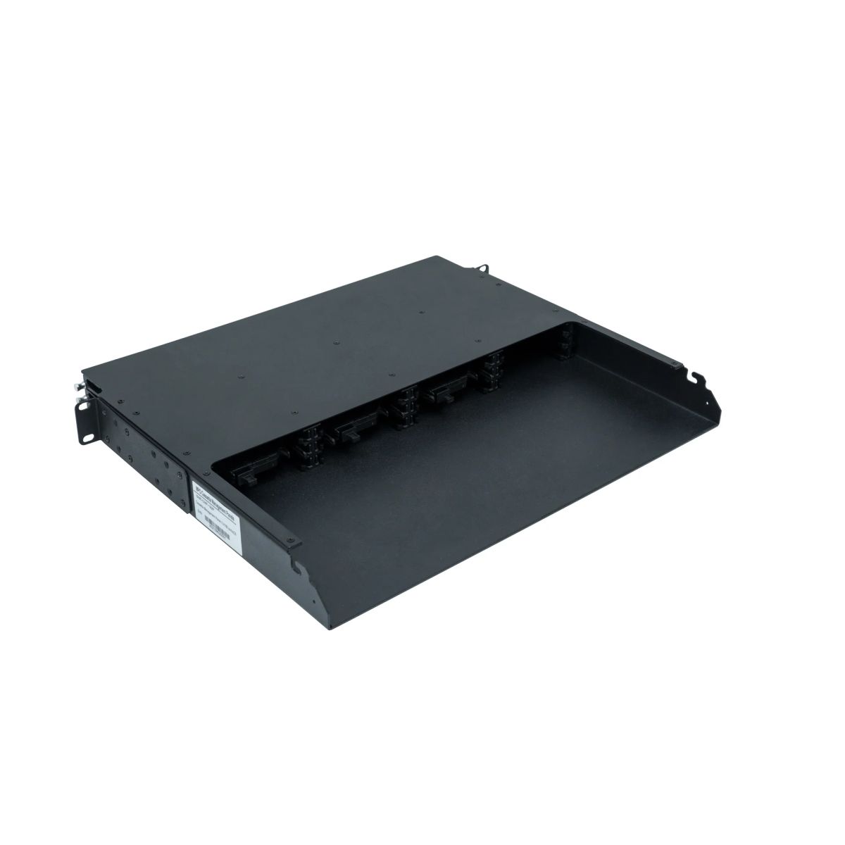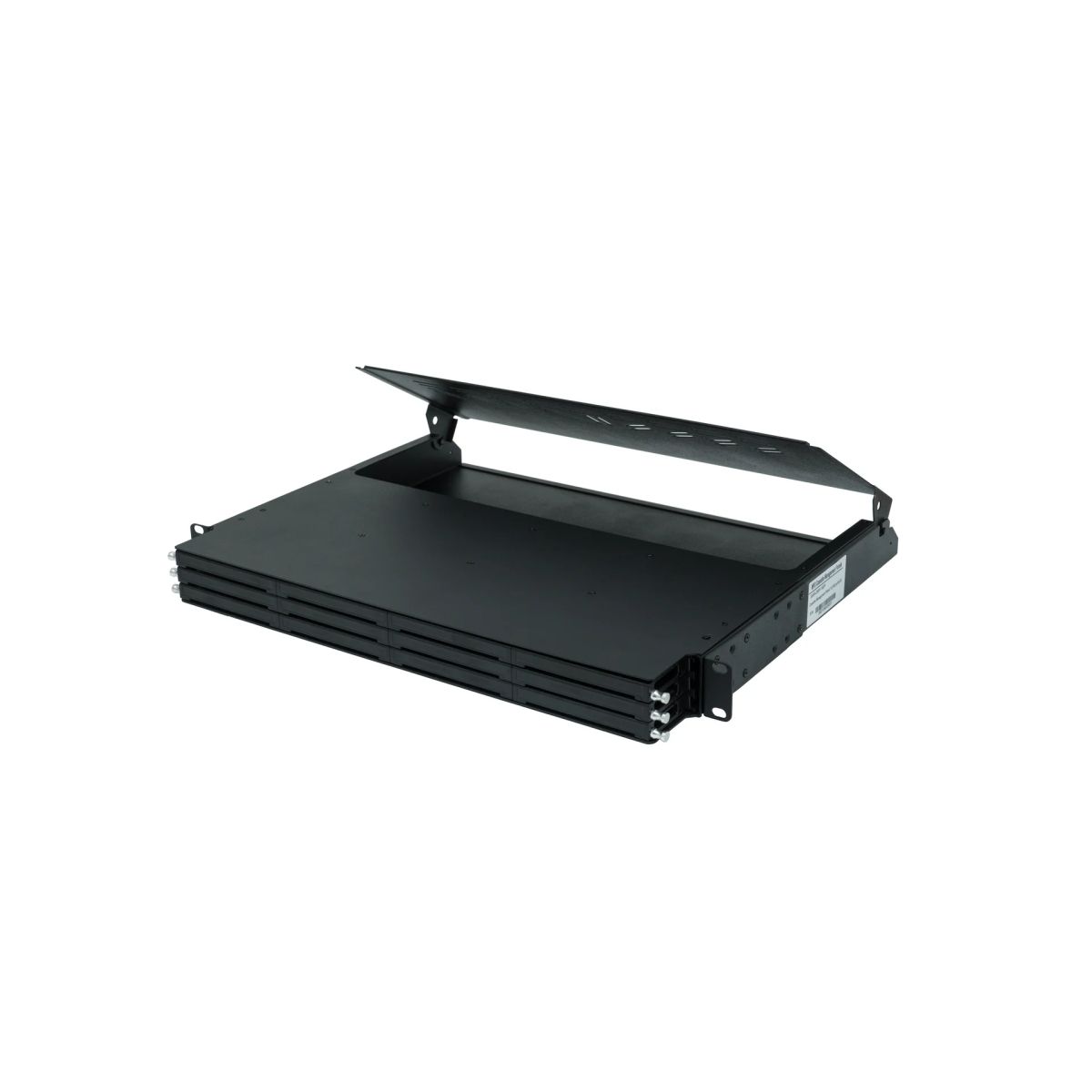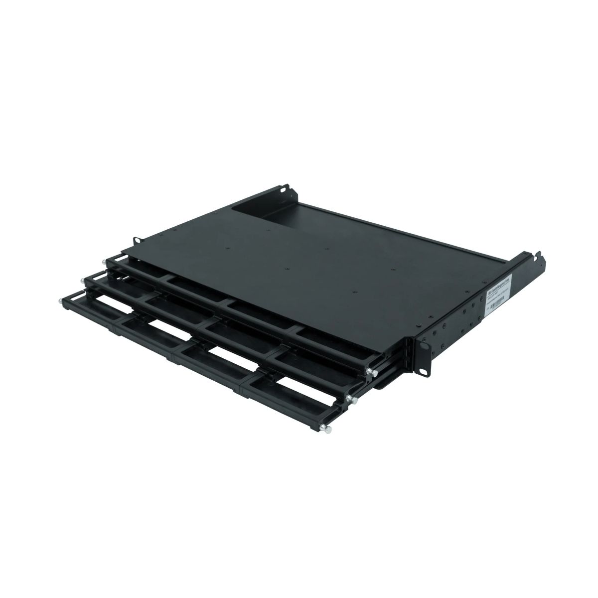 В эргономичном 1U корпусе размещены 3 выдвижных полки, в каждую из которых устанавливается до 4 распределительных кассет. Выдвижной механизм существенно упрощает процесс монтажа и обслуживания.
