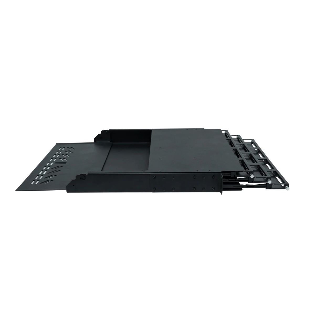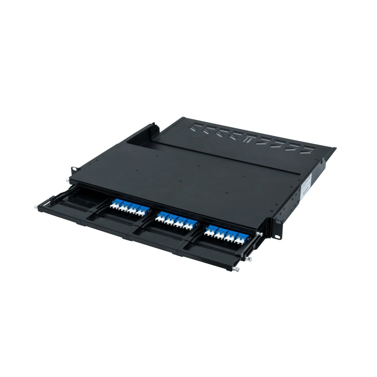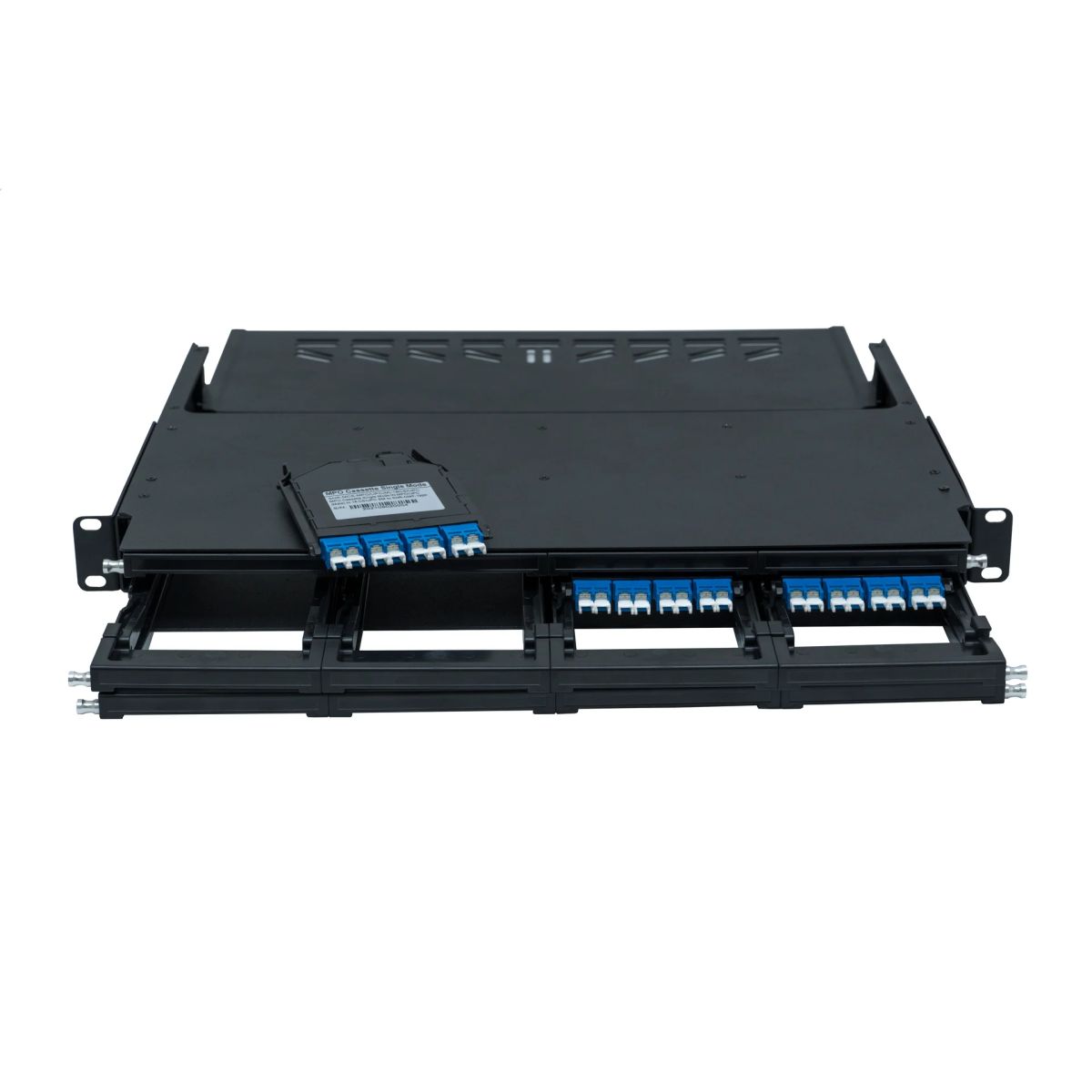 В эргономичном 1U корпусе размещены 3 выдвижных полки, в каждую из которых устанавливается до 4 распределительных кассет. Выдвижной механизм существенно упрощает процесс монтажа и обслуживания.