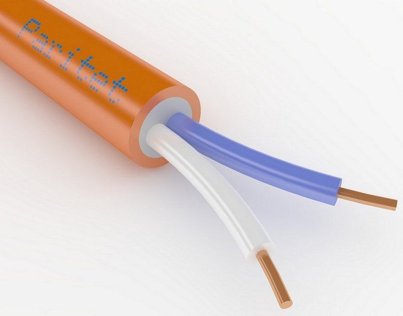 Кабель огнестойкий силовой с медными однопроволоч.жилами 2х1,5мм² (D-жилы = 1,38мм), для групповой внутренней стационарной прокладки, в т.ч. в составе огнестойкой кабельной линии (ОКЛ). Изоляция - кремнийорганическая резина. Сердечник - общая скрутка. Оболочка - термопластичная безгалогенная композиция оранжевого цвета. Наружный размер кабеля D=11 мм. Бухта 100 м.