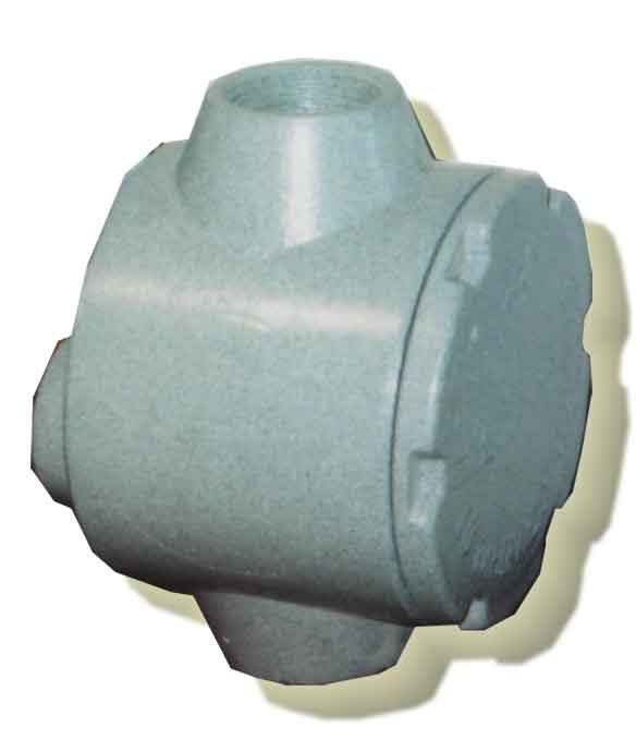 Коробка взрывозащищенная 1Еx d IIС Т6, тройниковая для выполнения соединений и ответвлений проводов и кабелей в стальных водо-газопроводных трубах (по ГОСТ 3262), 3 кабельных ввода (1 ввод в дно) с внутренней трубной цилиндрической резьбой «G 1"», IP 54, габ. размеры 104х140х81 мм, корпус из алюминиевого сплава