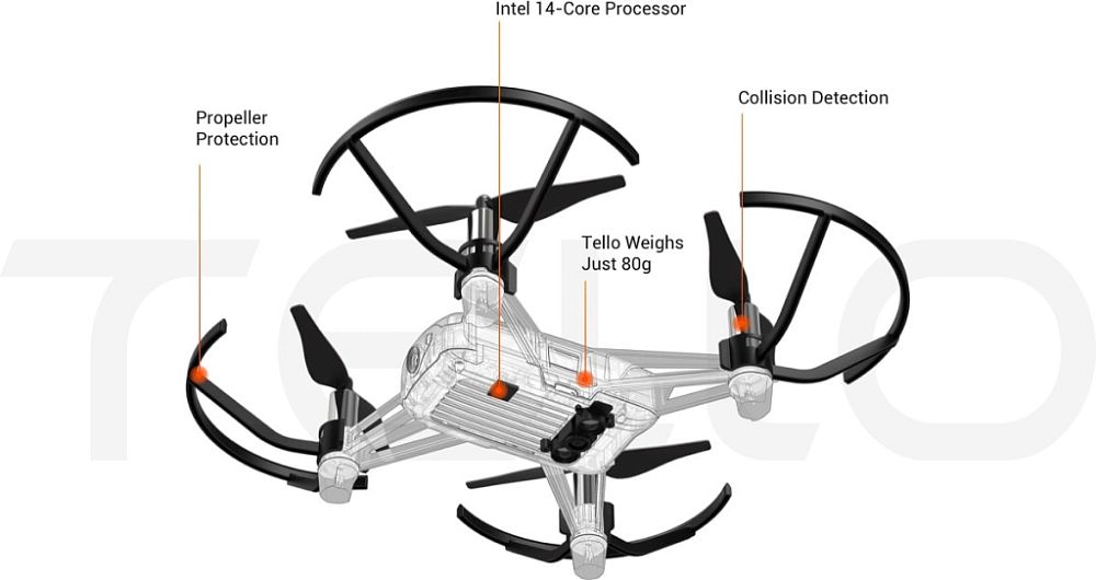 Tello — самый простой квадрокоптер, подходящий абсолютно для всех. С простым и понятным управлением справится даже ребенок. Коптер управляется через смартфон. Достаточно установить приложение и сразу можно начинать полет.