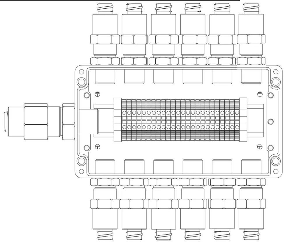 Коробка коммутационная взрывозащищенная 1ExeIIBT5Gb, клеммник 0.5...4 мм.кв. (I=25А) -24 шт, УХЛ1, IP67, t-раб.-60...+85°С, 120х220х91 мм. Корпус из алюминиевого сплава, универсальные кабельные вводы: под кабель 6...12 мм в металлорукаве 15 мм - 12 шт, под кабель 10...16 мм в металлорукаве 20 мм - 1 шт