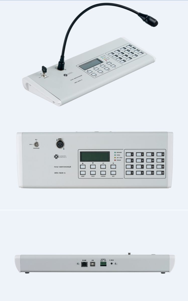 Пульт микрофонный МЕТА 18630-16, 16 зон, для речевого оповещения от микрофона и запуска в ручном режиме ранее записанного сообщения; ключ доступа для управления приоритетом; работает с приборами МЕТА 17950/17951; максимальная удалённость 1000м; внешнее питание не требуется; 390х160х55 мм