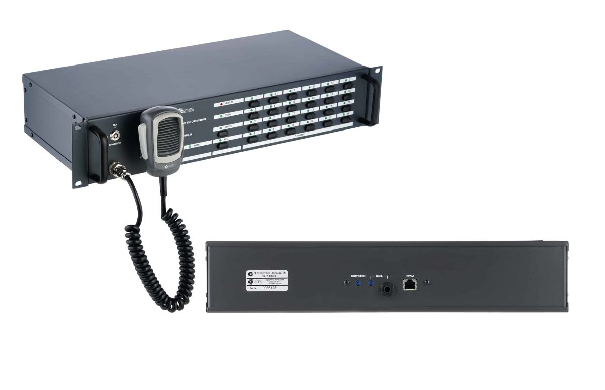 Селектор зон оповещения на 24 зоны, сигналы управления Сирена, RS-485, питание 24В, 70мА, 255х88х484