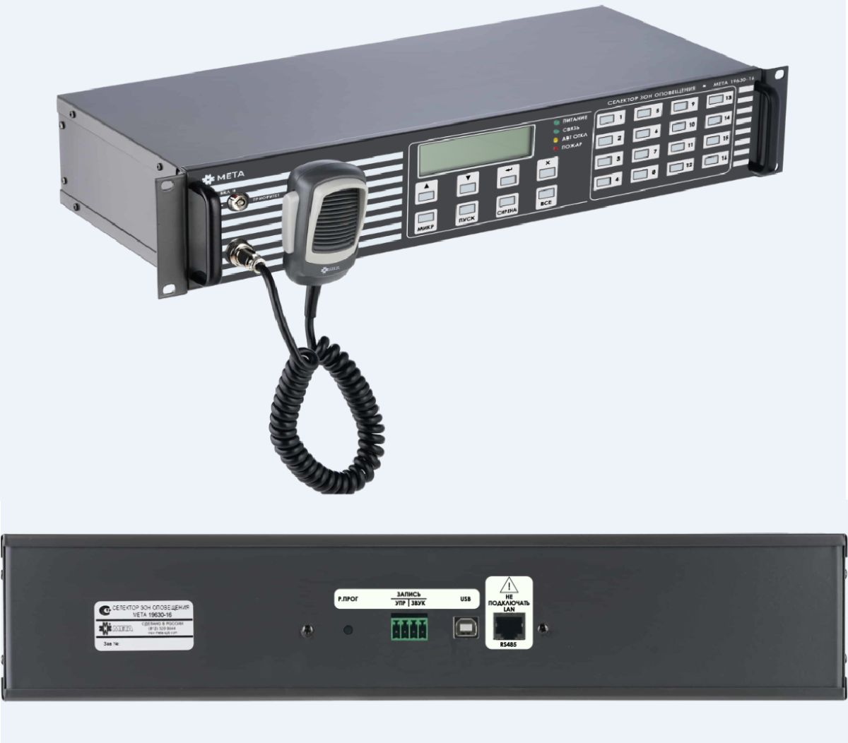 Селектор зон МЕТА 19630-24 на 24 зоны, предназначен для работы совместно с прибором управления оповещением МЕТА 19960, МЕТА 17950/17951; селектор зон обеспечивает возможность речевого оповещения от микрофона и запуска в ручном режиме ранее записанного сообщения; селектор зон МЕТА 19630 предназначен для монтажа в 19“ стойку; RS-485; диапазон частот тангенты 300-8000 Гц; длина линии не более 1000 м; 24В; 400 мА; 482х255х88 мм