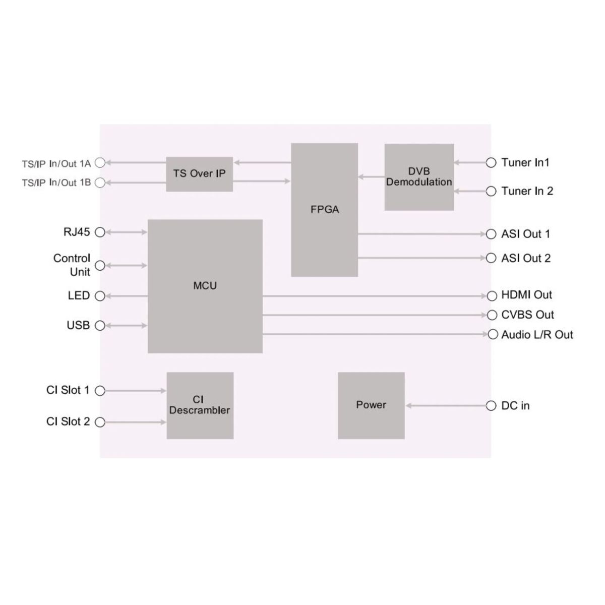- 2 выхода GbE, вывод принятого транспортного потока в виде SPTS/MPTS потока UDP/RTP unicast/multicast.