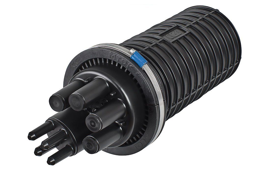 Муфта оптическая, 216 волокон, тупиковая, 4 круглых до 22 мм ввода/вывода, овальный ввод для транзитной петли( до 10 мм/до 25 мм/транзит 4/2/1), КЗДС муфта в комплекте, наружное исполнение, до 6 сплайс кассет (1 в комплекте), IP68, -60...+70°C, 494x216 мм.