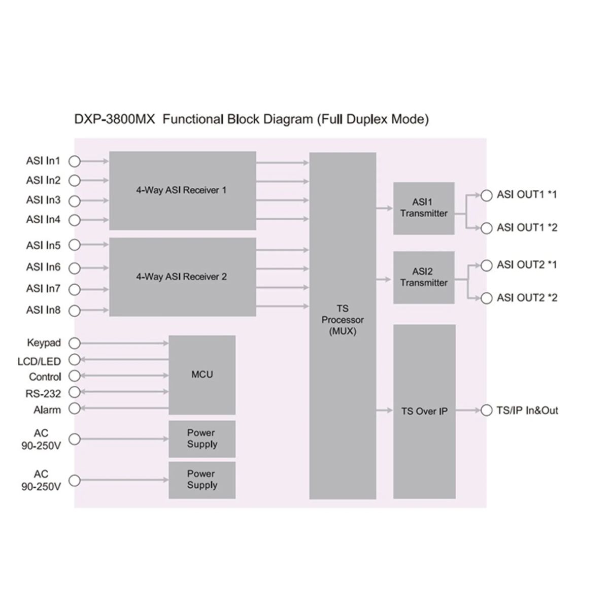 DVB-TS ремультиплексор DXP-3800MX производства компании PBI (Китай) может мультиплексировать до 18 транспортных потоков, полученных через порты ASI и GbE, и передавать сформированные потоки через порты ASI и GbE. Устройство способно ремультиплексировать до 256 сервисов (каналов), автоматически генерировать таблицы PSI/SI, фильтровать ненужные сервисы и производить их ремапинг.