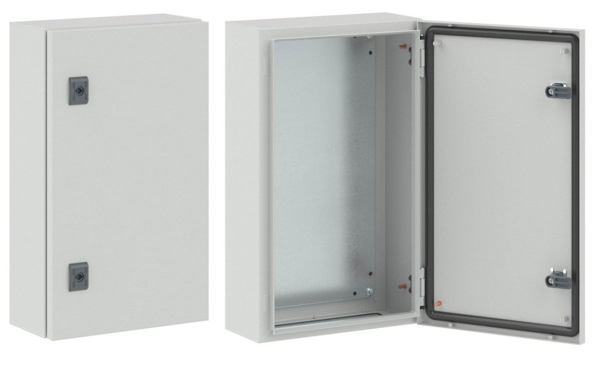 Корпус, монтажная плата, дверь, замок, фланец для ввода кабеля, монтажные аксессуары.