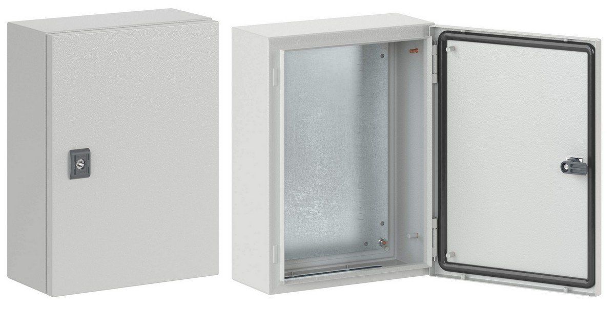 Корпус, монтажная плата, дверь, замок, фланец для ввода кабеля, монтажные аксессуары.
