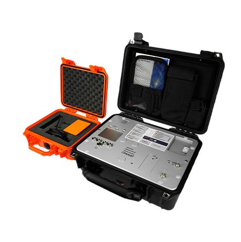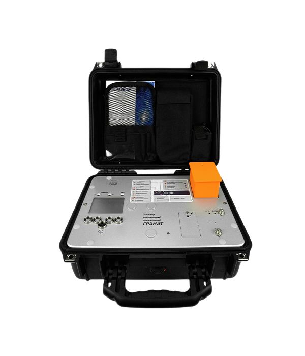 Конструкция переносного прибора ГРАНАТ — это кейс, в котором установлены детекторы, электронные блоки и GPS-модуль. Также имеется аккумулятор и внутренняя панель управления. На внешней стороне кейса также малогабаритная панель управления.