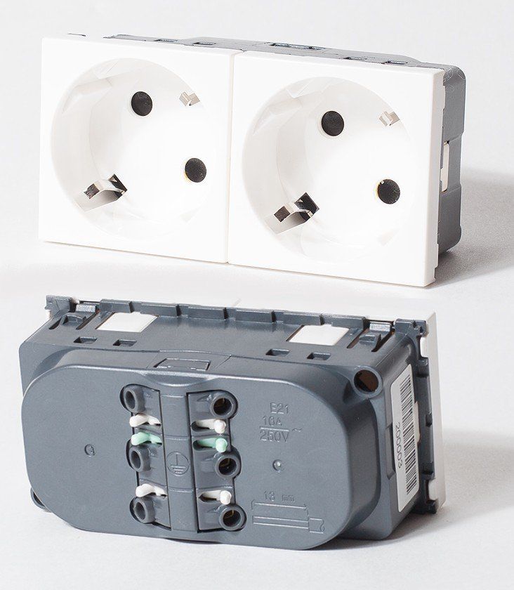 Розетка электрическая с заземлением (2К+З), для подключения вилки (штекера) под углом 45°, с защитными шторками, с безвинтовым зажимом, U-ном. 220 В, I-ном. 16 А, размер 45х45 мм - 2 модуля Modul45/"Mosaic", белая