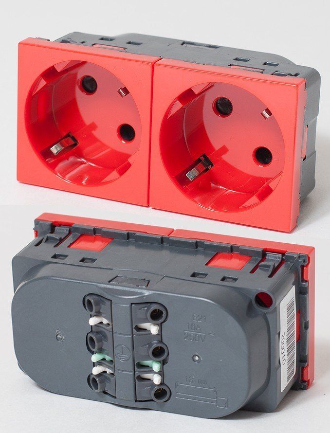 Розетка электрическая двойная с заземлением (2К+З), для подключения вилки (штекера) под углом 45°, с защитными шторками, с безвинтовым зажимом, U-ном. 220 В, I-ном. 16 А, размер 45х90 мм - 4 модуля Modul45/"Mosaic", красная